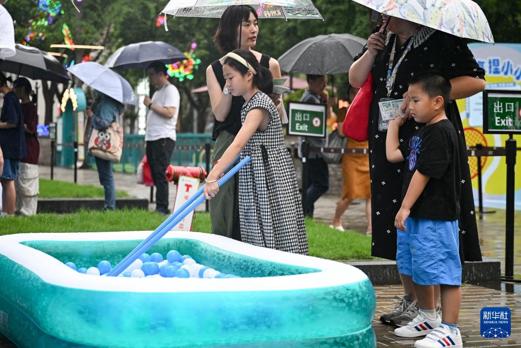 7月18日,小朋友在上海市虹口区的潮流市集上参与游戏活动。
