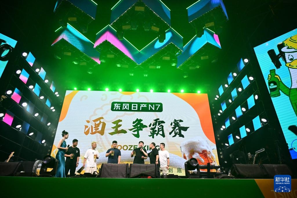 7月18日,选手在青岛西海岸新区金沙滩啤酒城内参加酒王争霸赛。