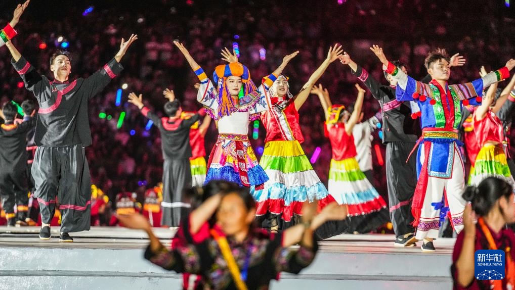 演员在六盘水市水城区海坪彝族火把节活动上表演开场舞(7月18日摄)。