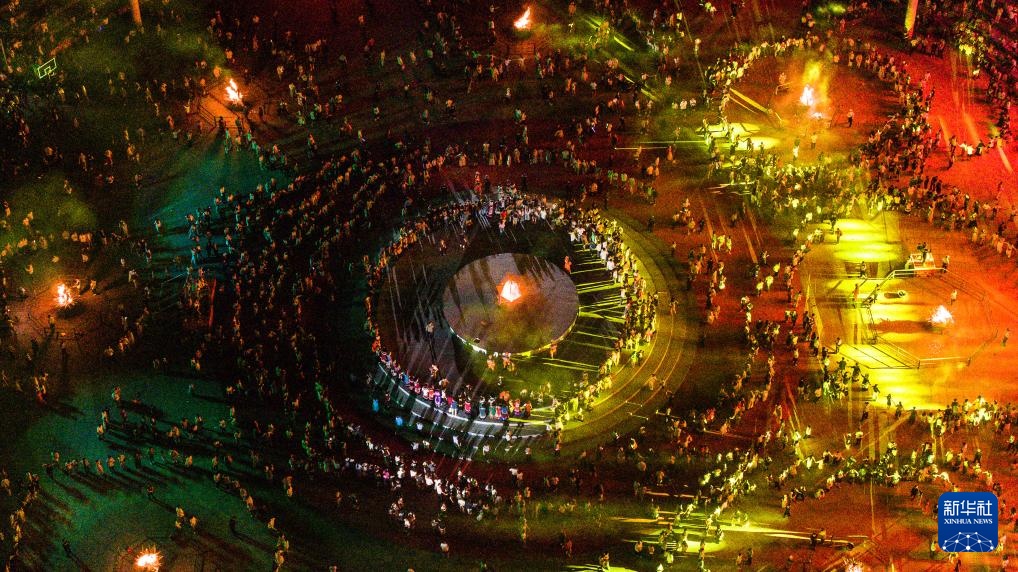 游客与彝族群众一起欢度火把节(7月18日摄,无人机照片)。