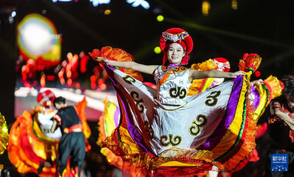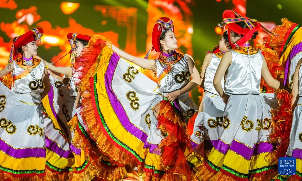 演员在六盘水市水城区海坪彝族火把节活动上表演歌舞《七月火把节》(7月18日摄)。