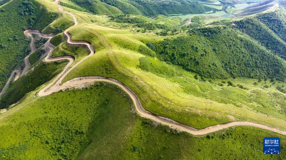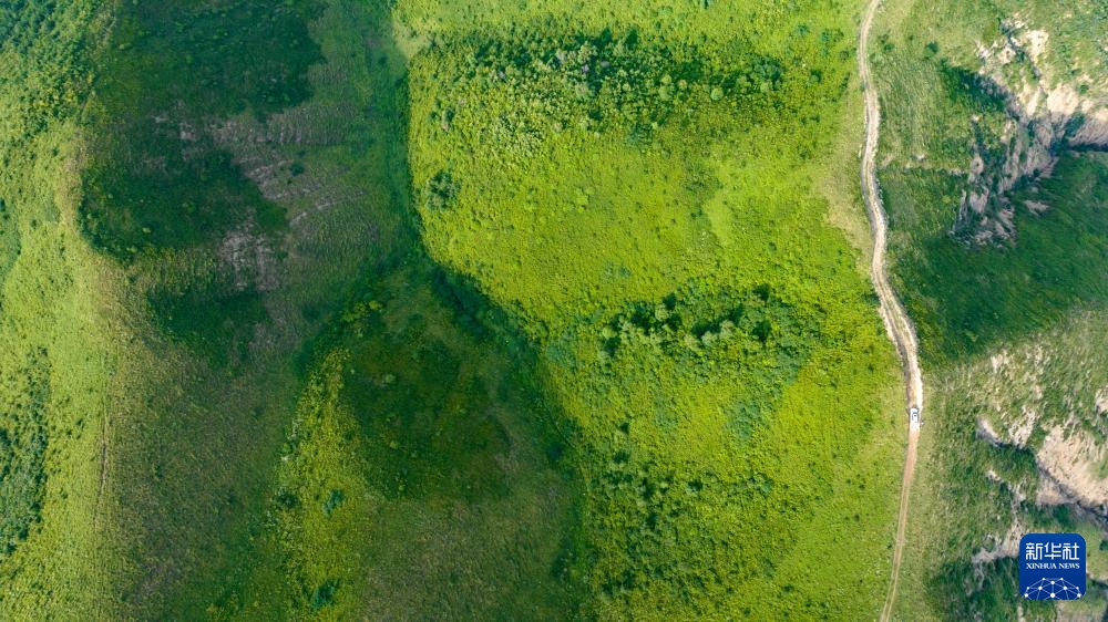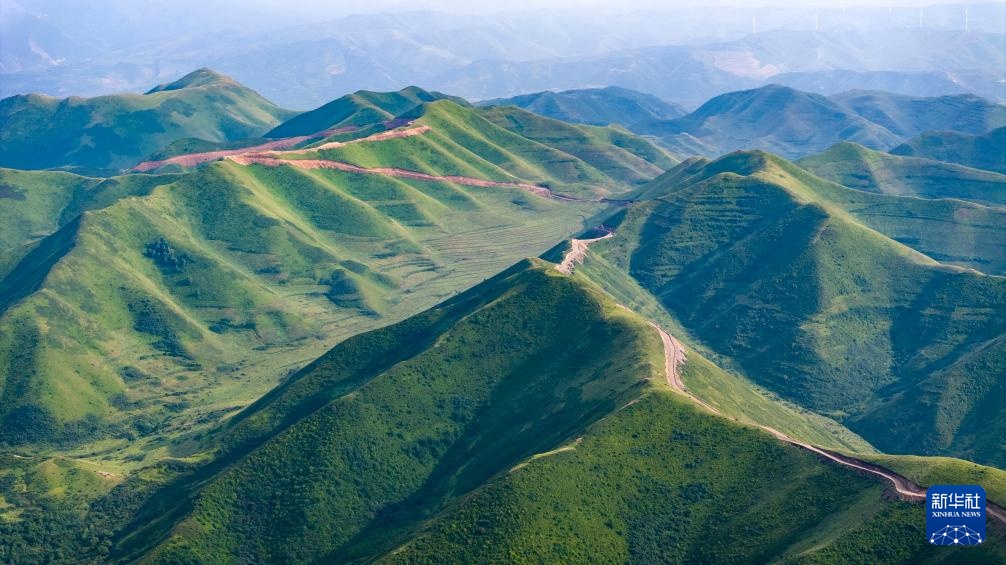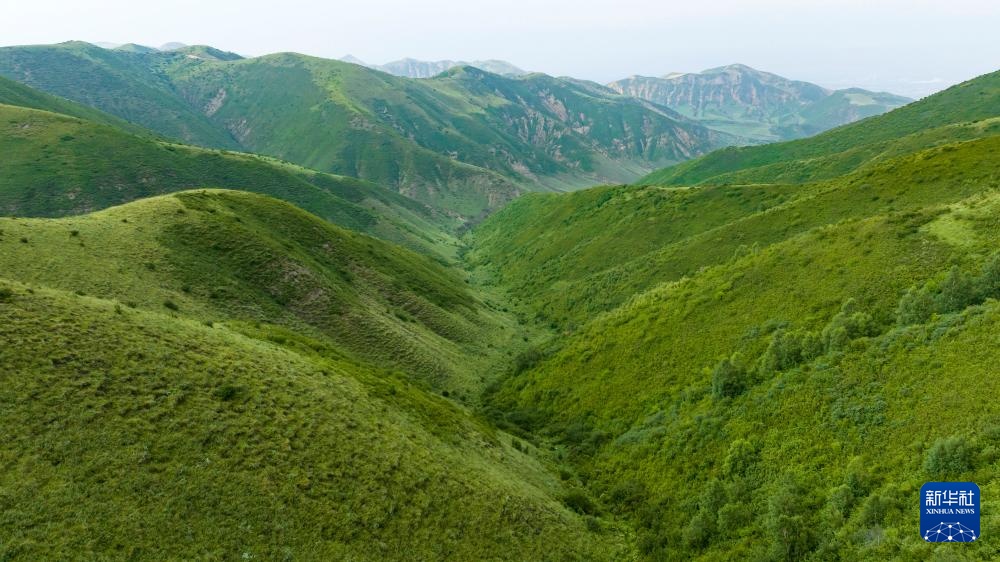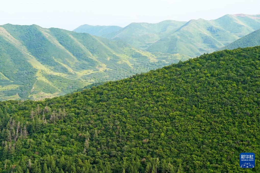 宁夏固原市原州区马东山林场山坡被绿色覆盖(7月17日摄,无人机照片)。