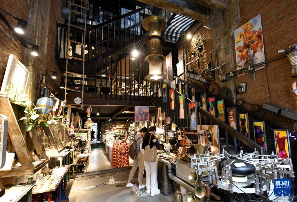 游人在艺术园区内的一家铁艺空间参观(7月16日摄)。