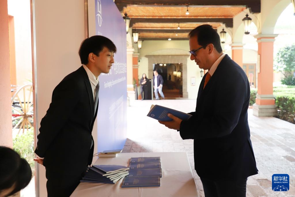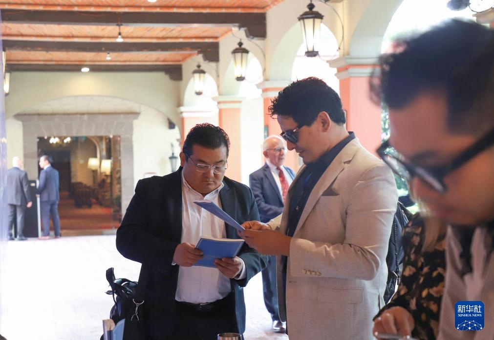 7月18日,在墨西哥首都墨西哥城,嘉宾在“红厅论坛·中墨文明交流互鉴对话会”上翻阅《在世界文化激荡中坚守文化主体性——中国式现代化发展道路的精神基石》智库报告。