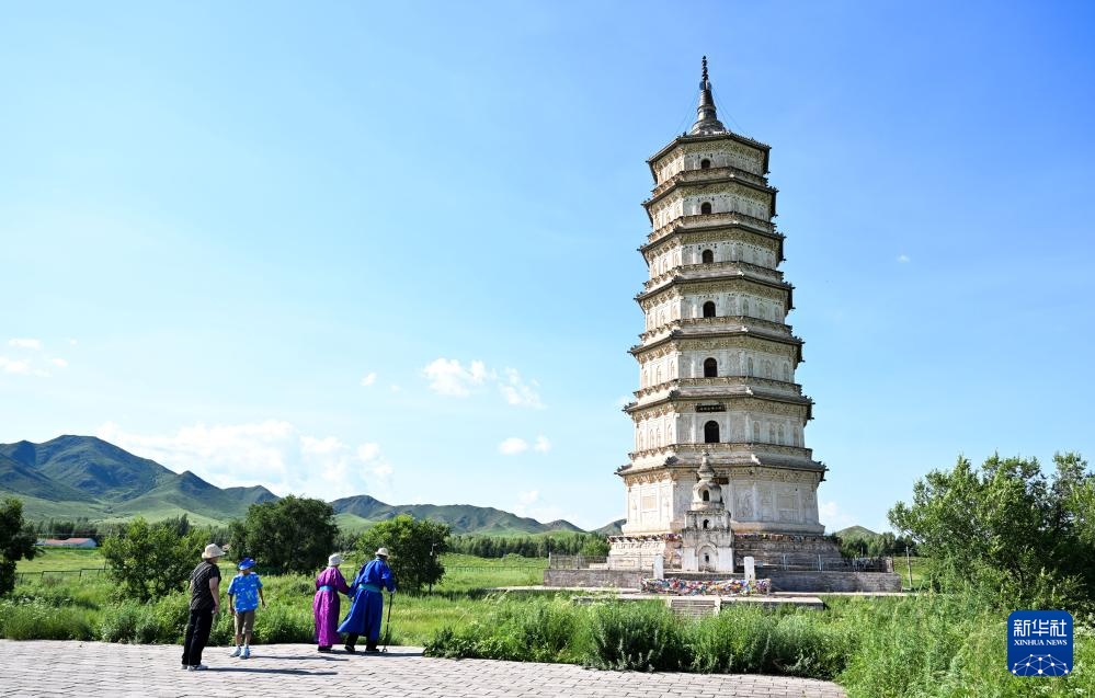 7月20日,游客在内蒙古赤峰市巴林右旗辽庆州白塔参观游玩。