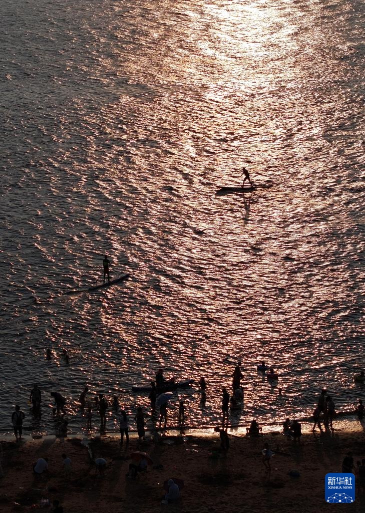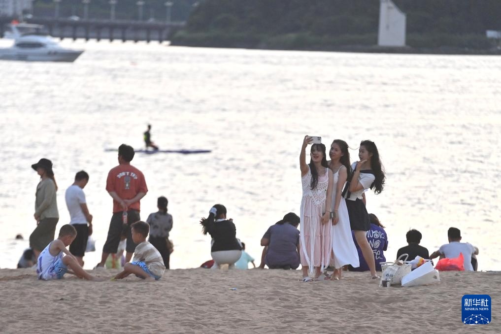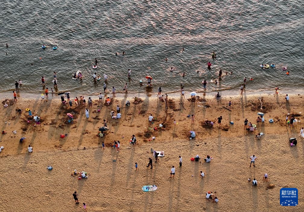 市民和游客在防城港市西湾旅游景区沙滩浴场游玩(7月6日摄)。