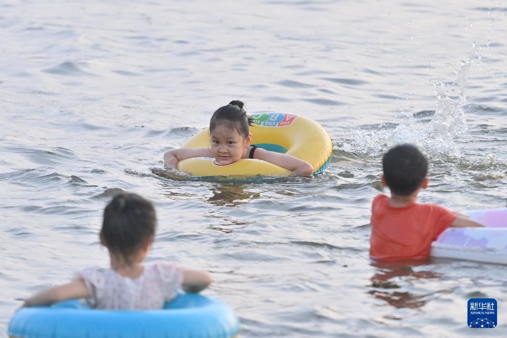 小朋友在防城港市西湾旅游景区沙滩浴场戏水消暑(7月6日摄)。