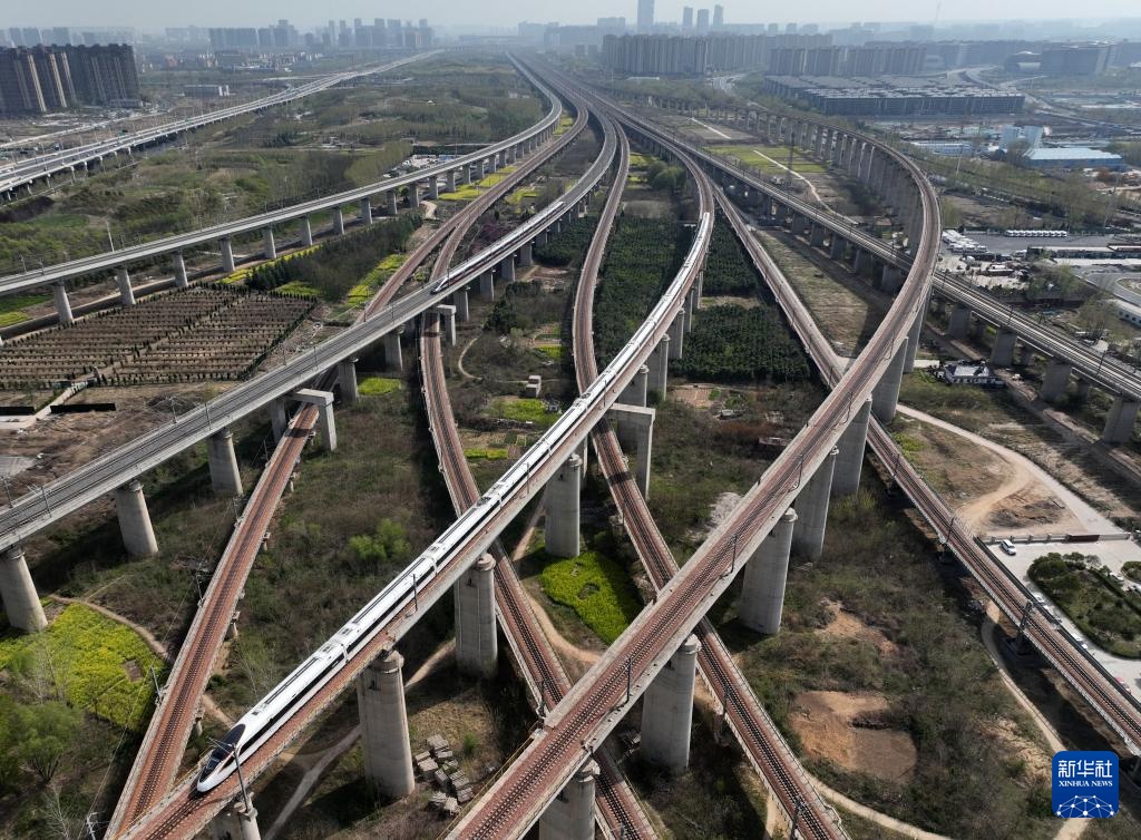 3月31日在河南省郑州市拍摄的纵横交错的高铁线路(无人机照片)。