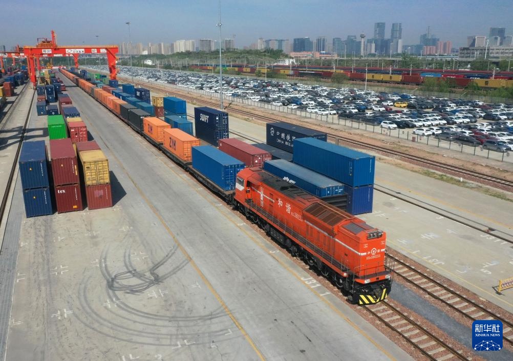 4月15日,X8003次中欧班列(郑州)停靠在国铁集团郑州局圃田车站(无人机照片)。