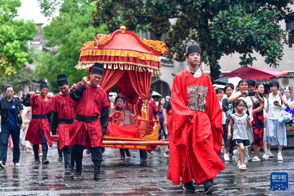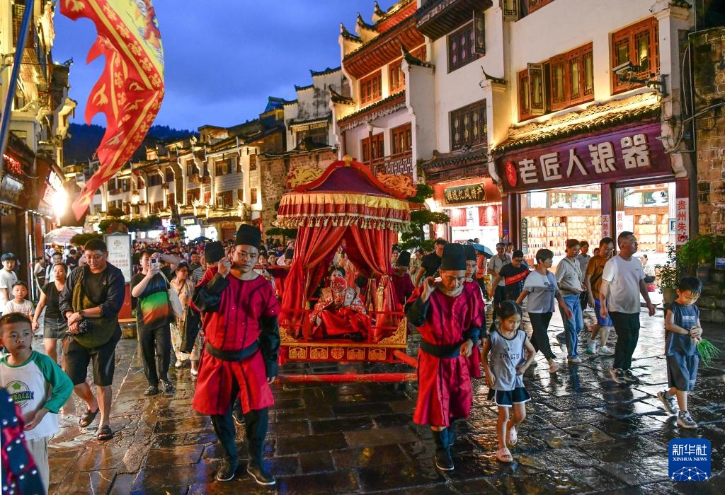 7月22日,当地群众在镇远古城参加“龙神嫁妹”民俗巡游展演。
