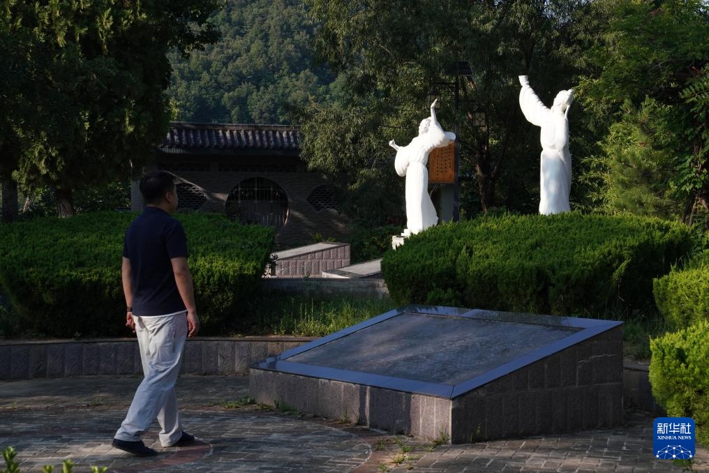7月14日,在甘肃省陇南市徽县大河店镇青泥村,游客观赏李白和杜甫的雕塑。