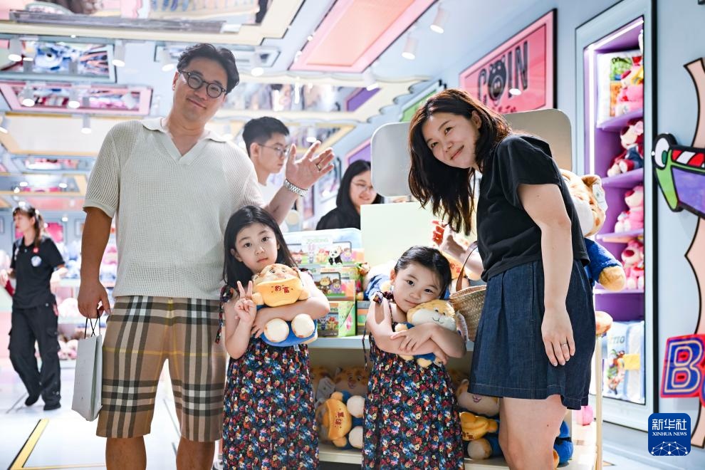 7月17日,韩国游客在位于上海市南京路步行街的一家潮玩店里购物。