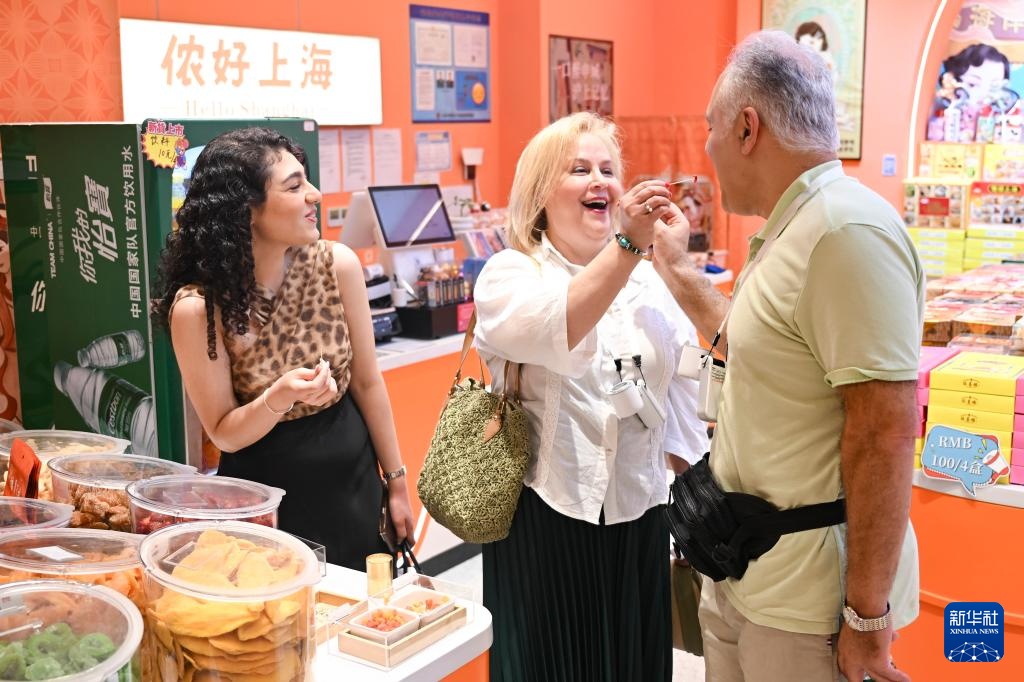 7月17日,一名伊朗留学生(左)带着父母在位于上海市南京路步行街的一家礼品店内品尝特色食品。