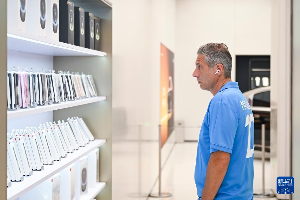7月17日,一名外国游客在位于上海市南京路步行街的华为商店里浏览电子产品。