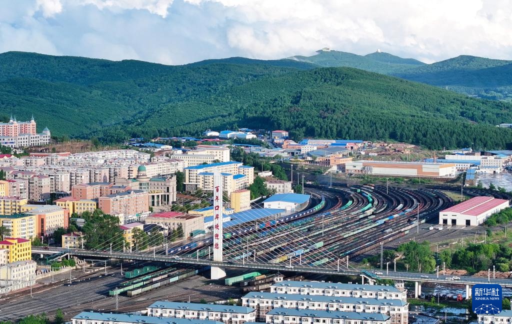 6月17日,中国铁路哈尔滨局集团有限公司绥芬河站南站场,满载货物的入境列车等待解体换装(无人机照片)。
