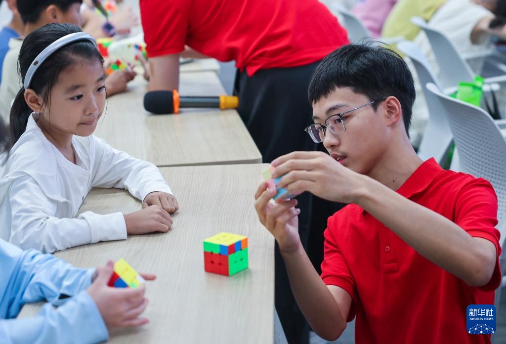 7月23日,志愿者在西山社区党群服务中心的暑期爱心教室给孩子们上魔方课。