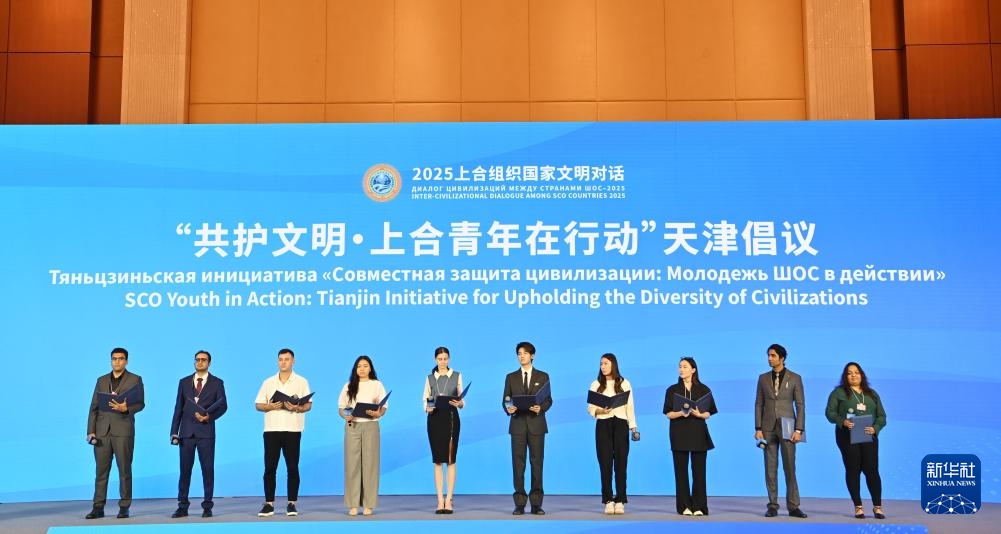 7月23日在2025上合组织国家文明对话现场拍摄的“共护文明·上合青年在行动”天津倡议发布环节。
