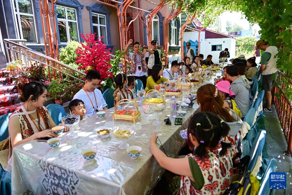 游客在新疆伊犁哈萨克自治州伊宁市伊犁老城喀赞其文化旅游区家访点品尝当地美食(7月23日摄)。