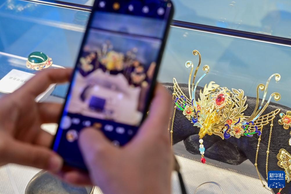 游客在新疆伊犁哈萨克自治州伊宁市伊犁老城喀赞其文化旅游区传统技艺展示区挑选商品(7月23日摄)。