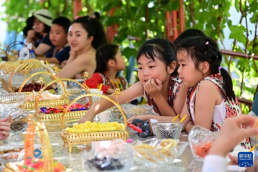 研学游的小朋友在新疆伊犁哈萨克自治州伊宁市伊犁老城喀赞其文化旅游区学做当地特色糕点(7月23日摄)。