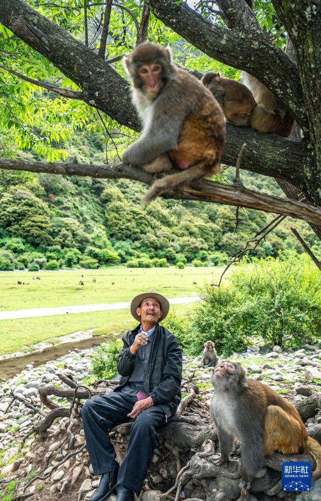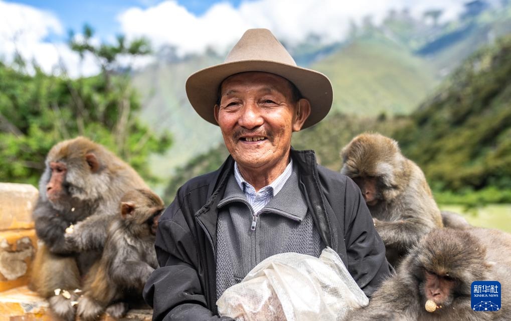 在林则生态文化旅游景区,多布杰老人被藏猕猴围绕(7月23日摄)。