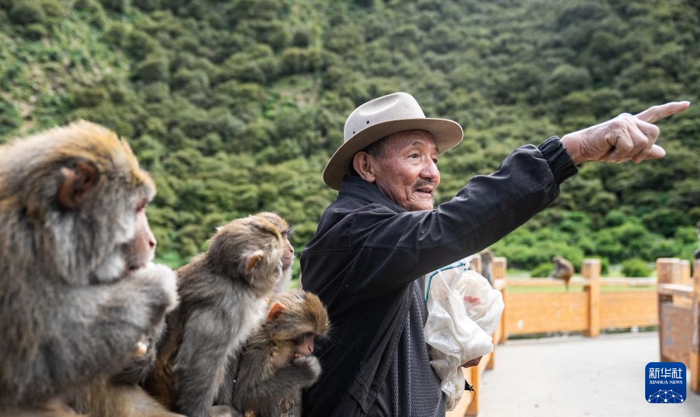 在林则生态文化旅游景区,工作人员在为多布杰老人(中)准备喂藏猕猴吃的花生(7月23日摄)。