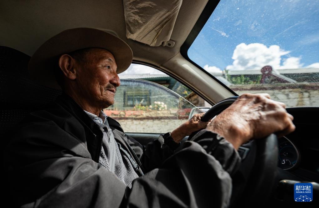 多布杰老人驾车前往林则生态文化旅游景区(7月23日摄)。