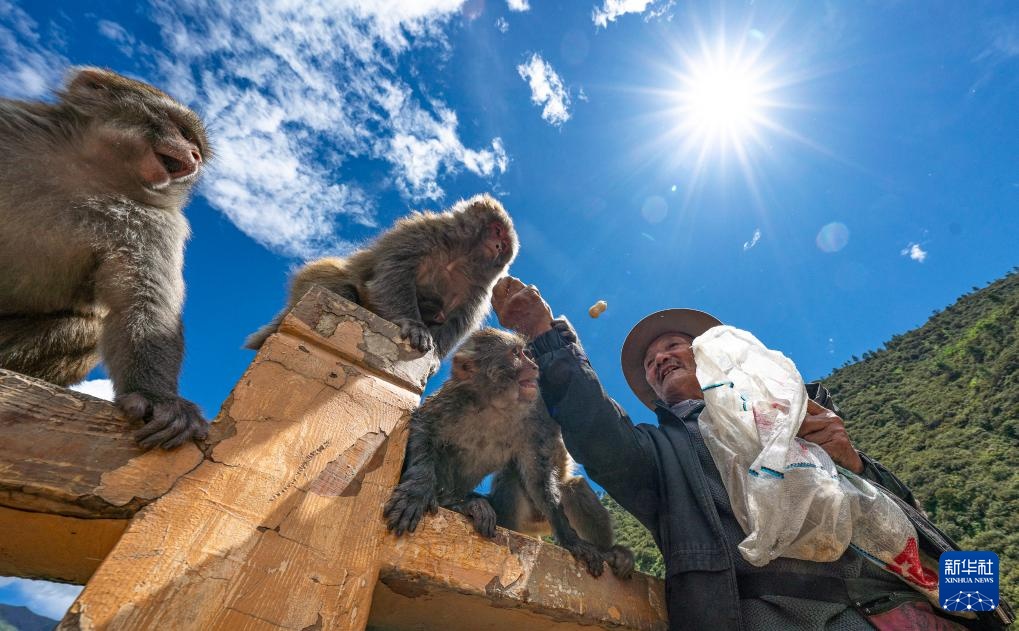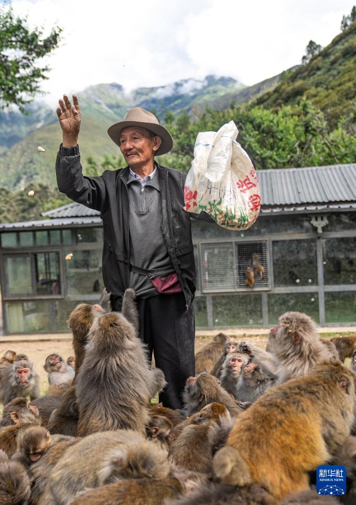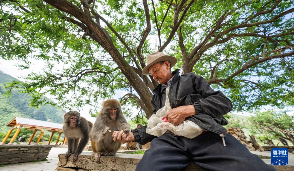 在林则生态文化旅游景区,多布杰老人在给藏猕猴喂花生(7月23日摄)。