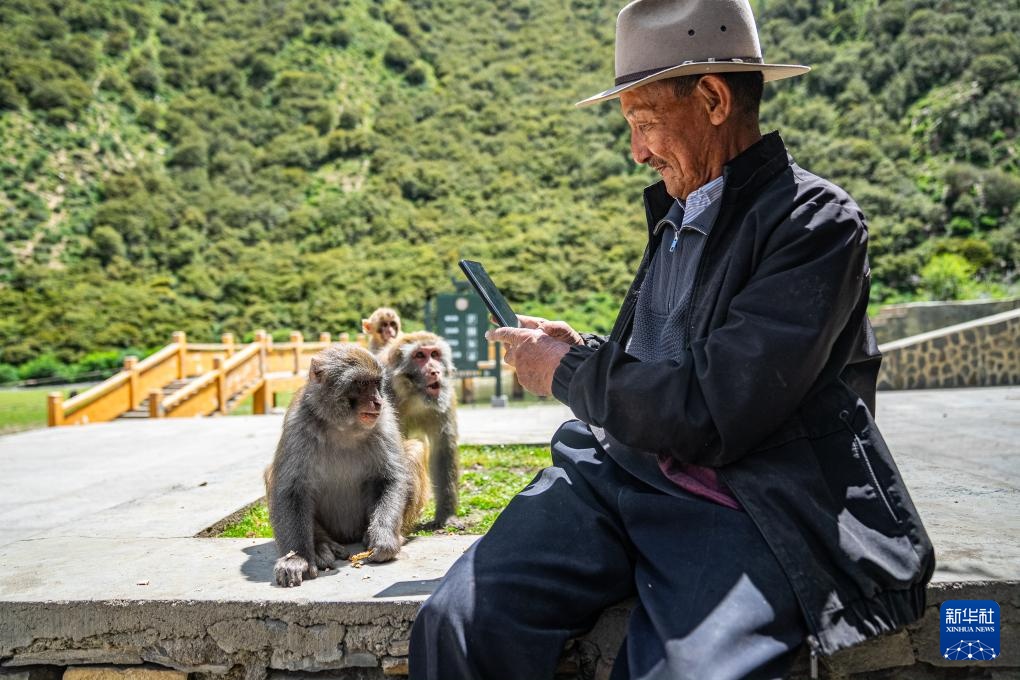在林则生态文化旅游景区,多布杰老人给藏猕猴拍照(7月23日摄)。