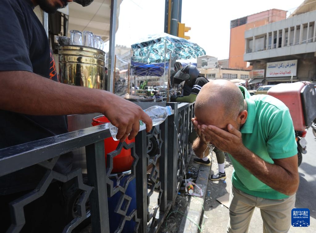 7月2日,一名男子在伊拉克首都巴格达街头洗脸降温。