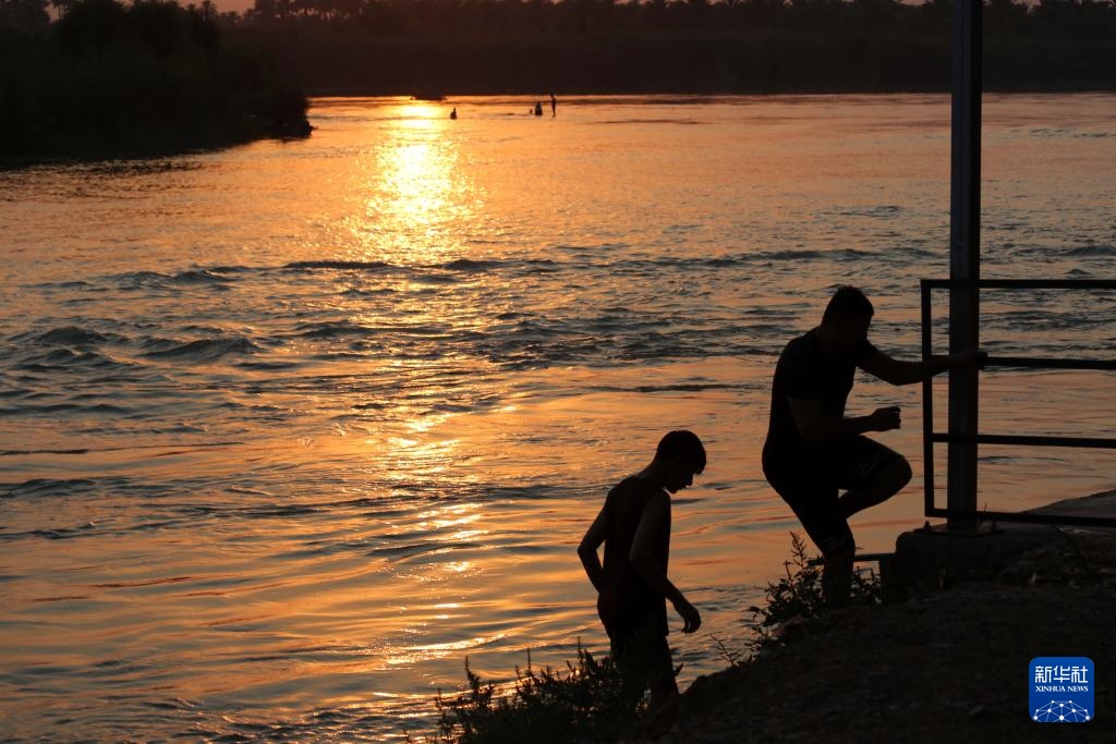 7月11日,在伊拉克首都巴格达,人们在底格里斯河畔避暑。