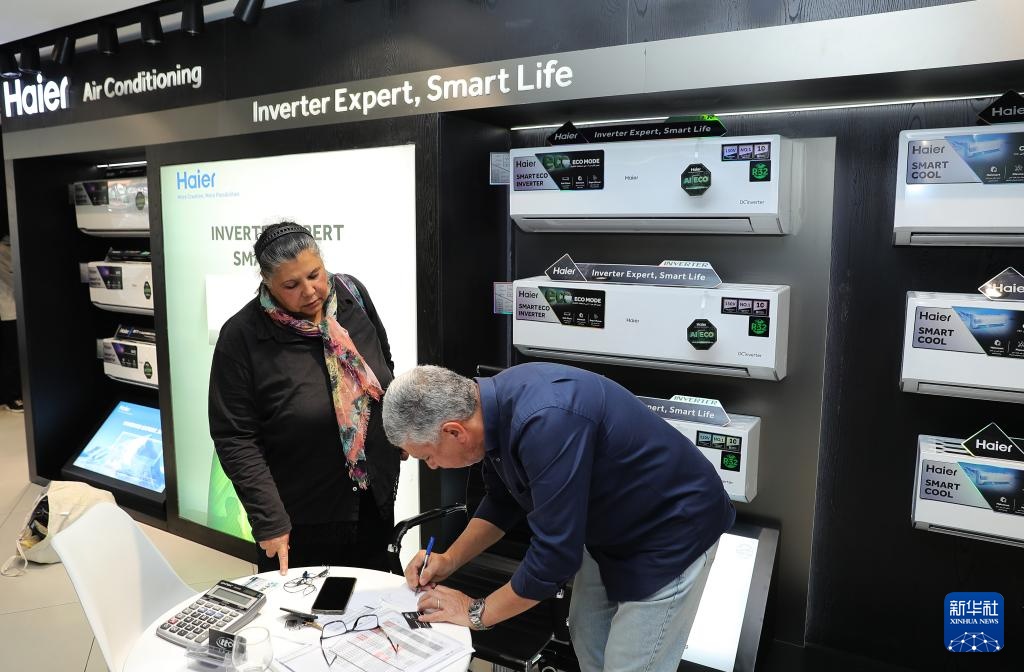 7月16日,在埃及首都开罗,顾客在海尔空调专卖店内选购空调。