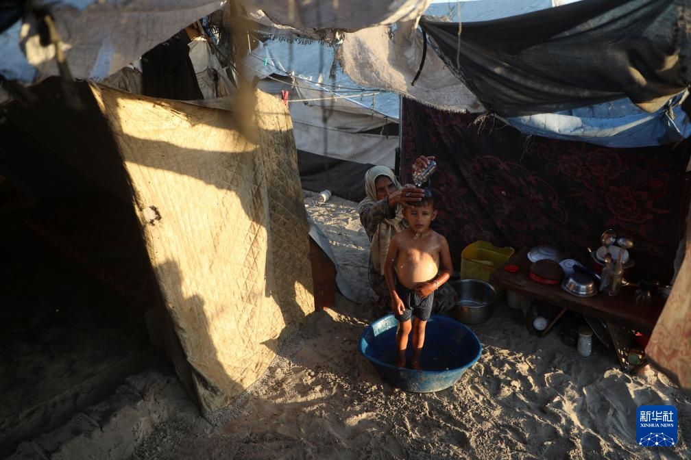 7月18日,在加沙城海边的一处流离失所者营地,巴勒斯坦儿童在洗澡。