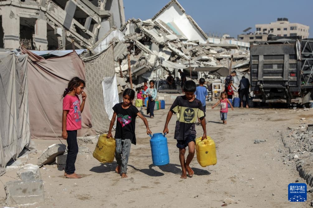 7月17日,巴勒斯坦儿童在加沙城取水。