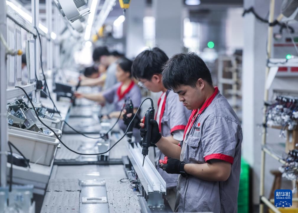 7月24日,在位于金华市金义新区的浙江好易点智能科技有限公司数字化车间,工人在流水线上加工产品。