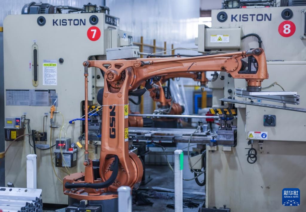 7月24日,在位于金华市金义新区的浙江好易点智能科技有限公司数字化车间,自动化晾衣杆冲压线上的机械臂在加工晾衣杆。