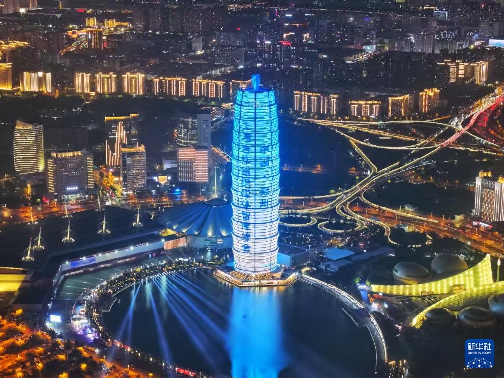 7月23日晚,郑州国际会展中心旁的千玺广场主楼亮灯宣传上海合作组织媒体智库峰会(无人机照片)。郑州国际会展中心是峰会举办地。