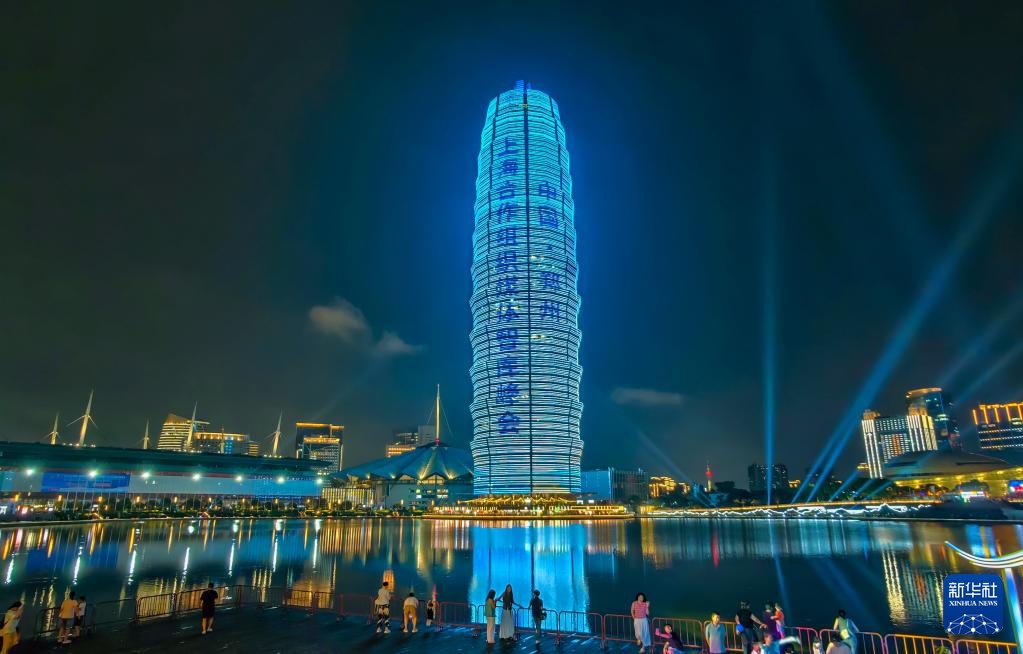 7月23日晚,郑州国际会展中心旁的千玺广场主楼亮灯宣传上海合作组织媒体智库峰会。郑州国际会展中心是峰会举办地。