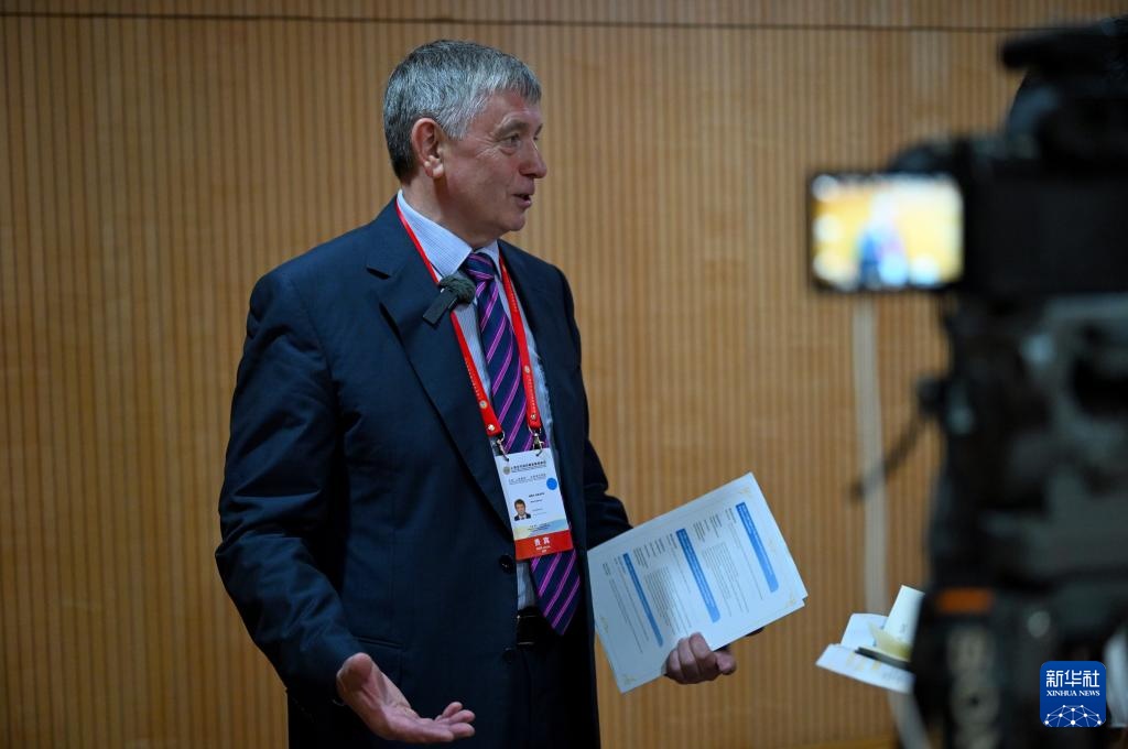 7月24日,在河南郑州举行的上海合作组织媒体智库峰会会场,与会代表接受媒体采访。