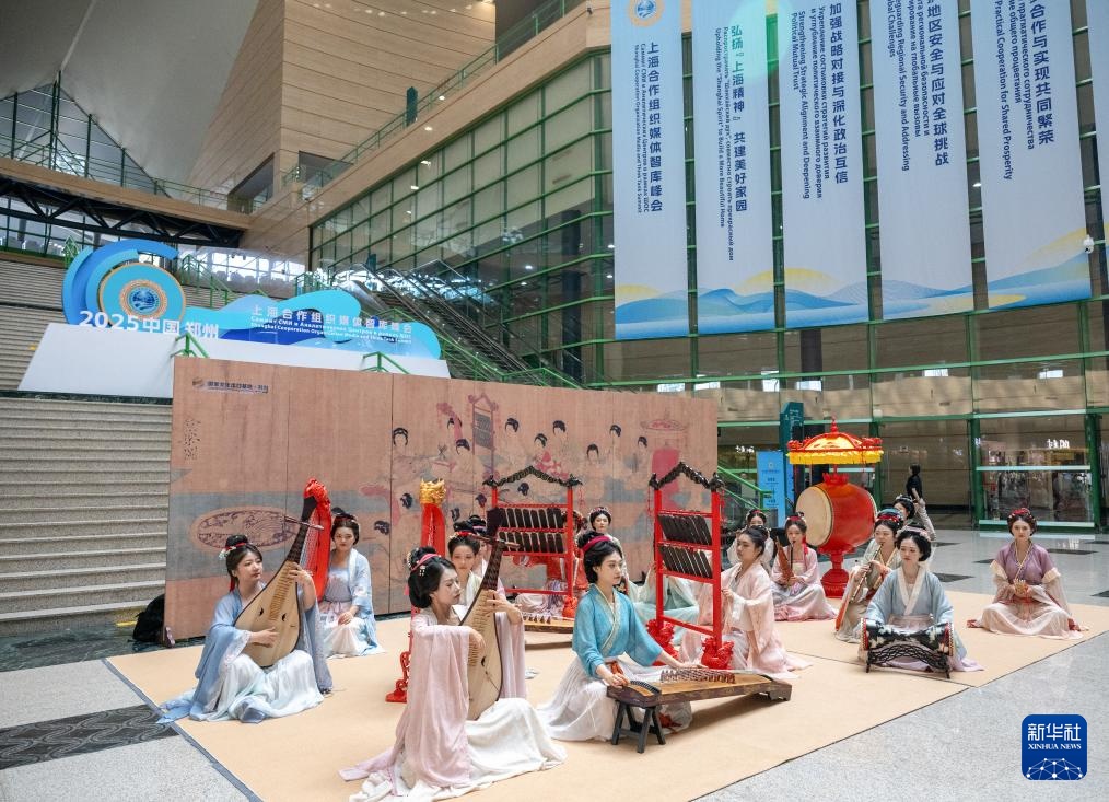 7月24日,在河南郑州举行的上海合作组织媒体智库峰会会场,媒体记者拍摄《合乐图》民族乐器复刻展演。