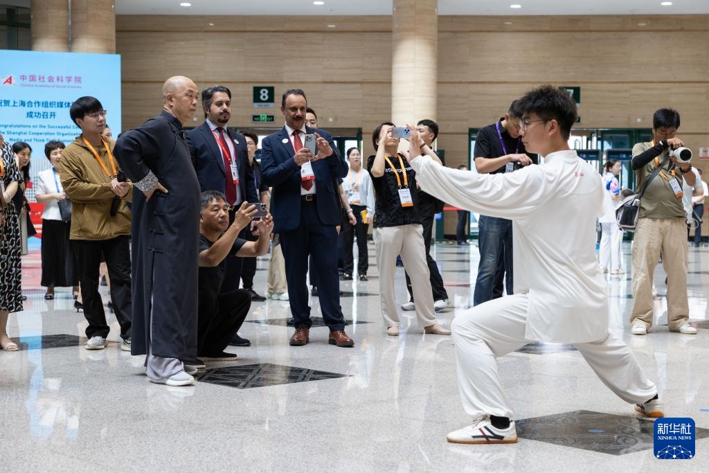 7月24日,在河南郑州举行的上海合作组织媒体智库峰会会场,与会代表观看太极拳表演。