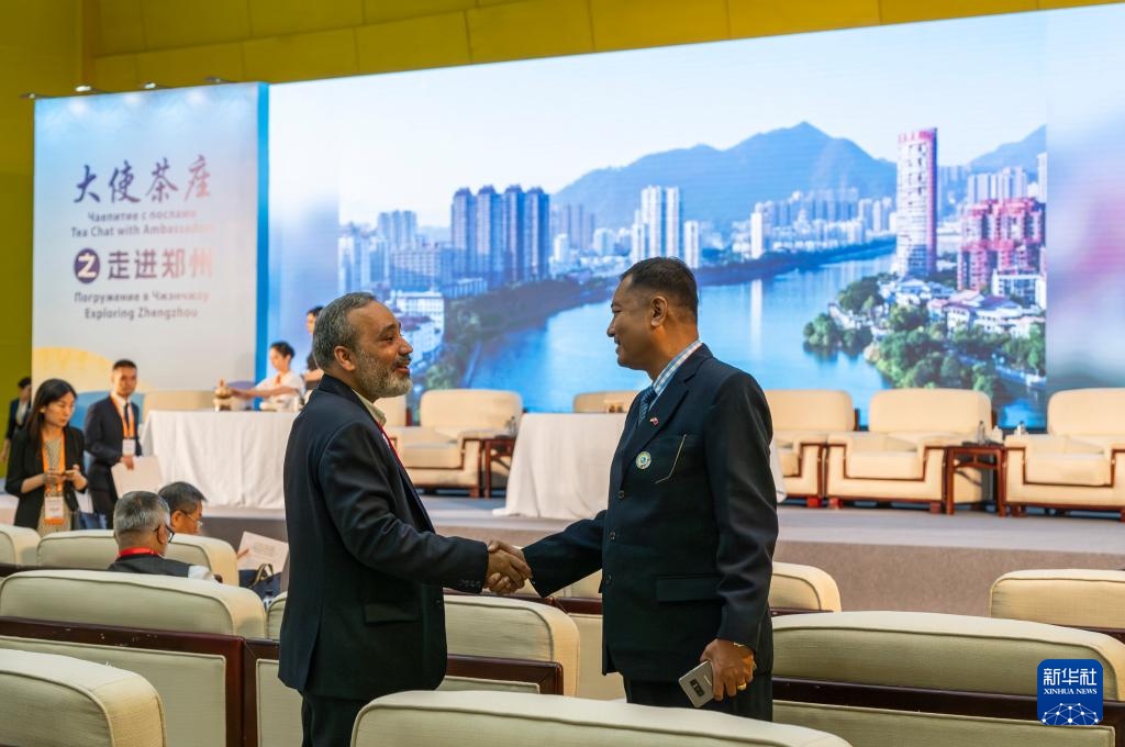 7月24日,在河南郑州举行的上海合作组织媒体智库峰会会场,与会代表握手寒暄。