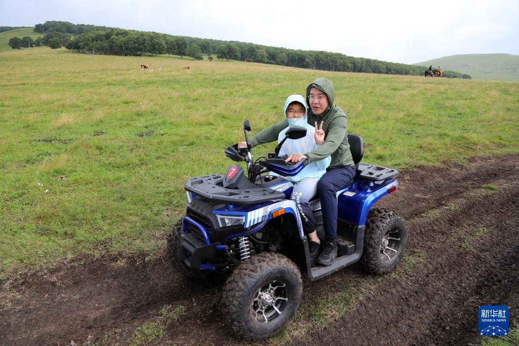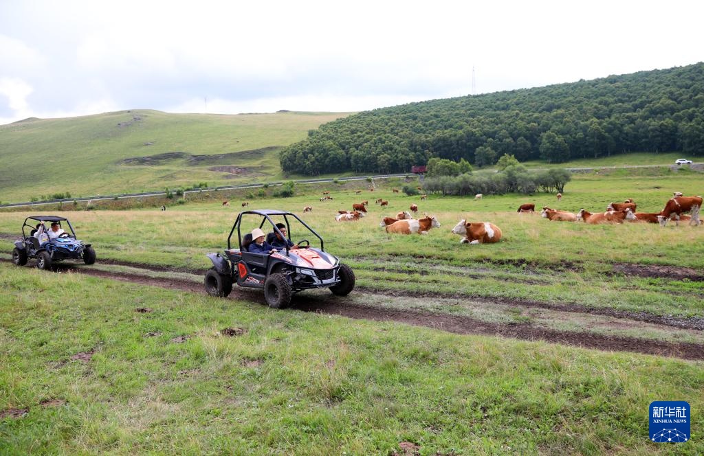 7月24日,游客在内蒙古自治区赤峰市克什克腾旗草原驾乘草地车。