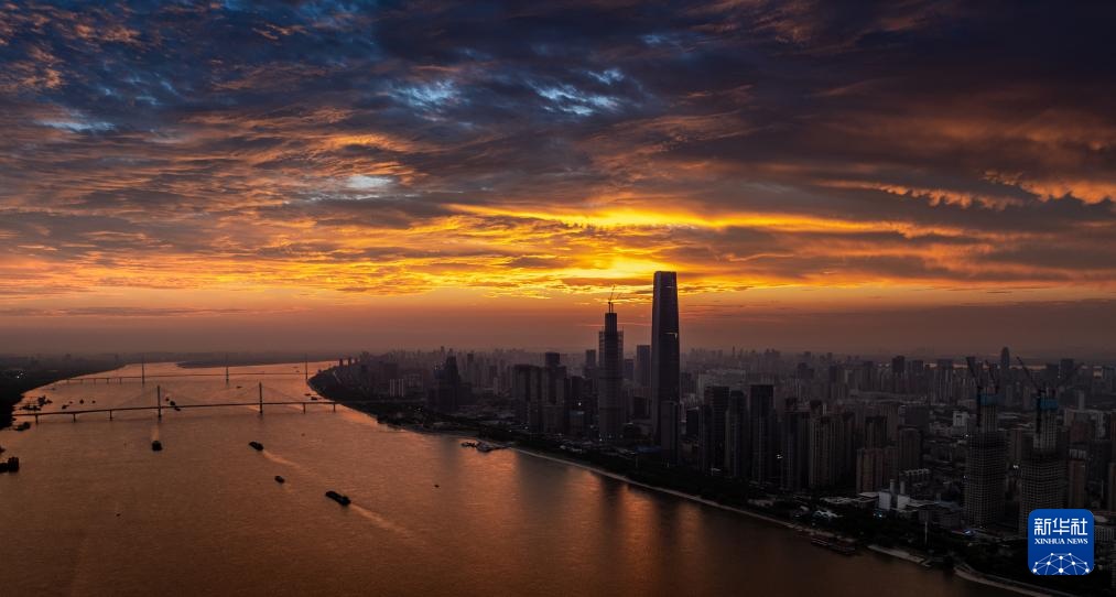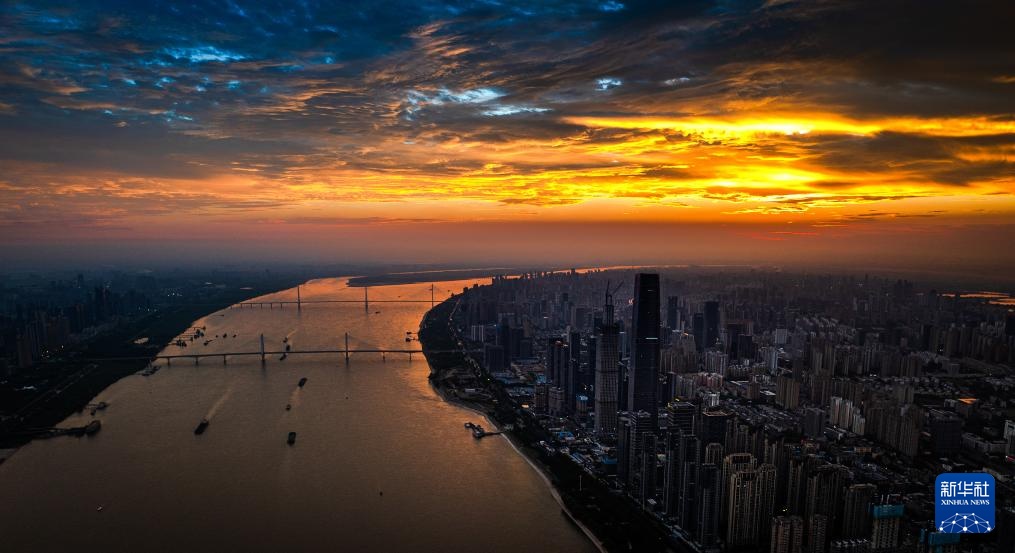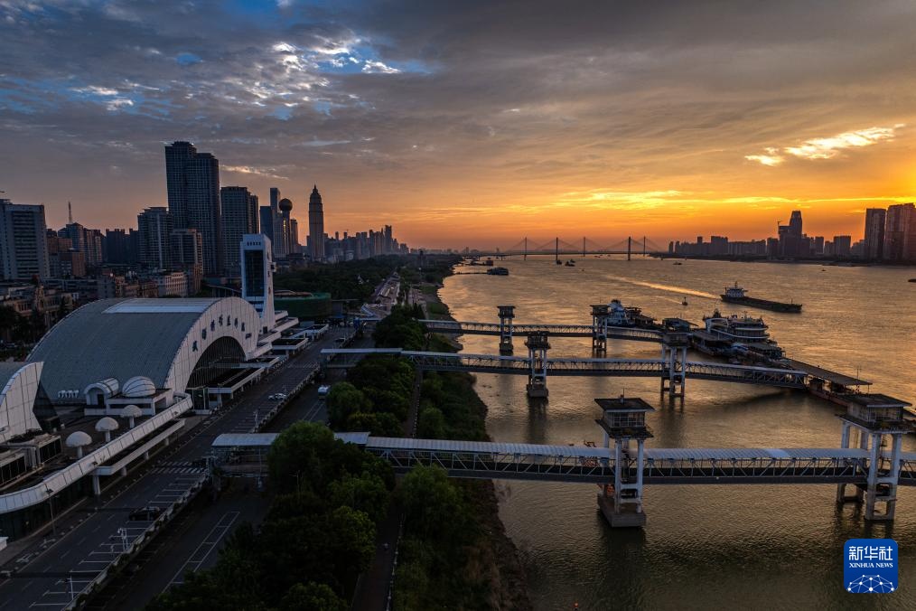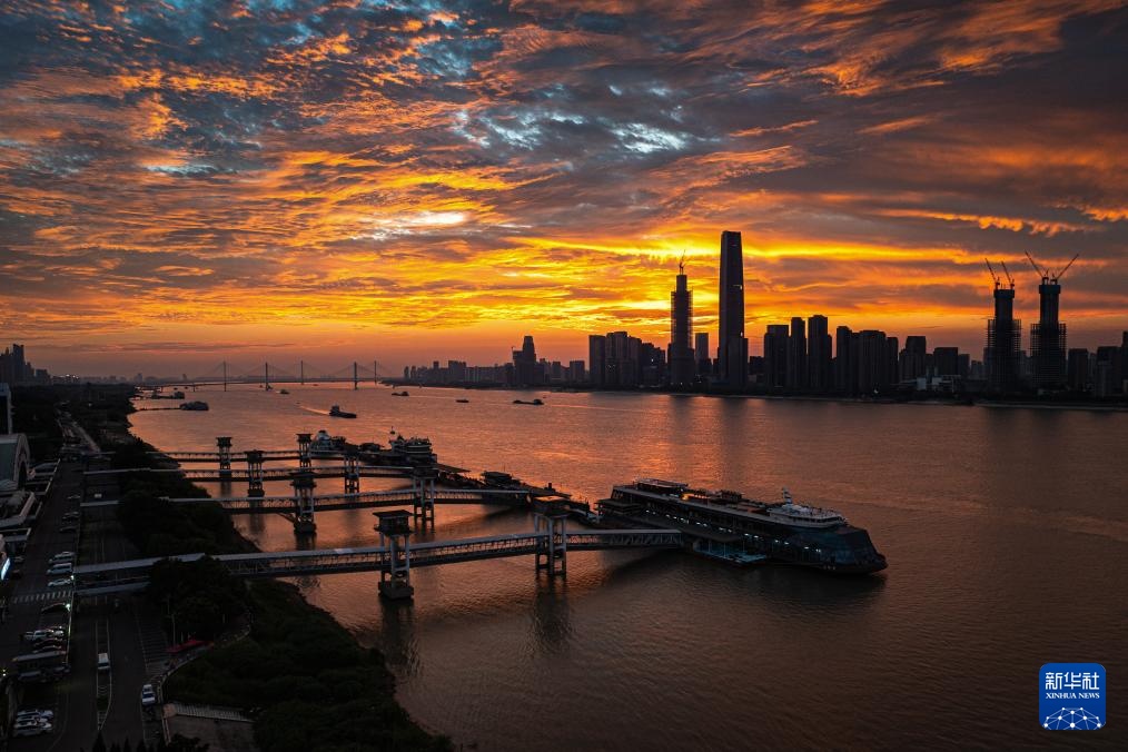 7月26日清晨,船舶伴着朝霞行驶在长江武汉江段(无人机照片)。