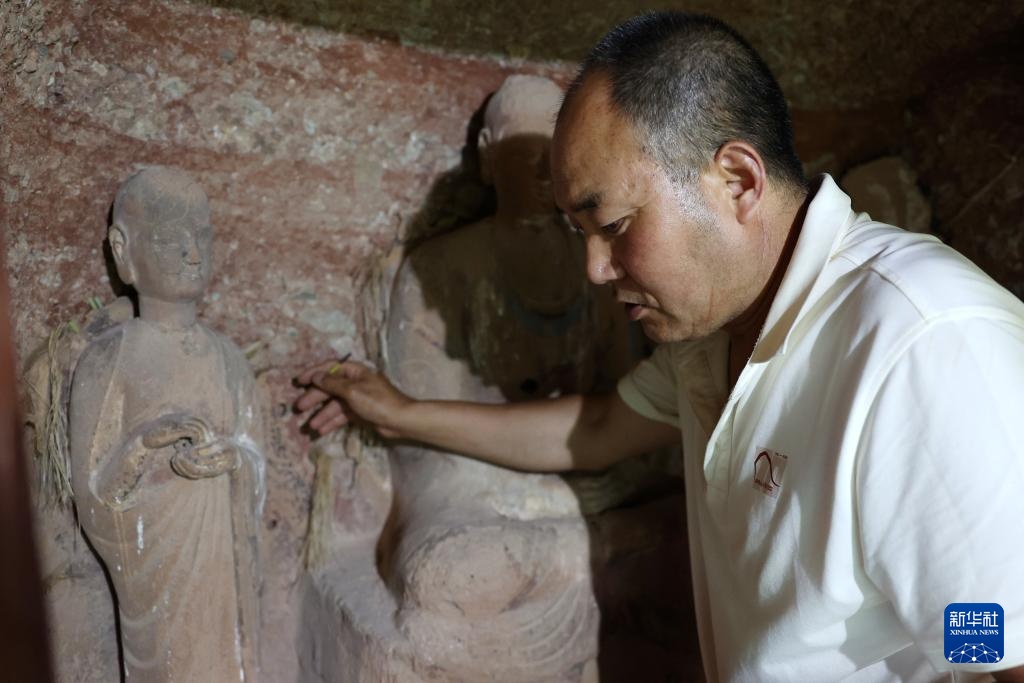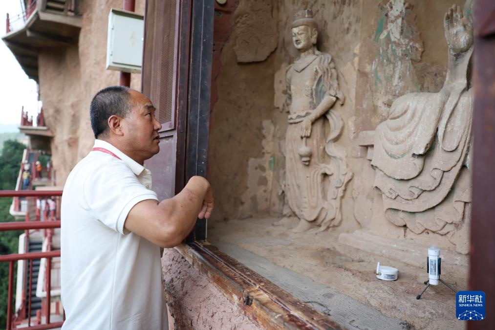牟常有查看麦积山石窟44窟的塑像(7月16日摄)。