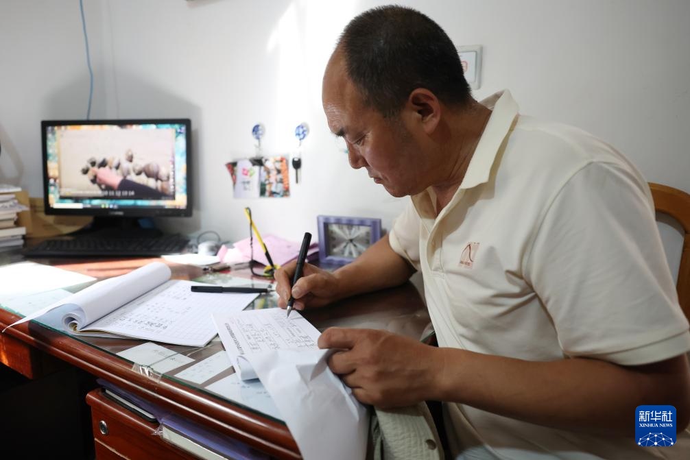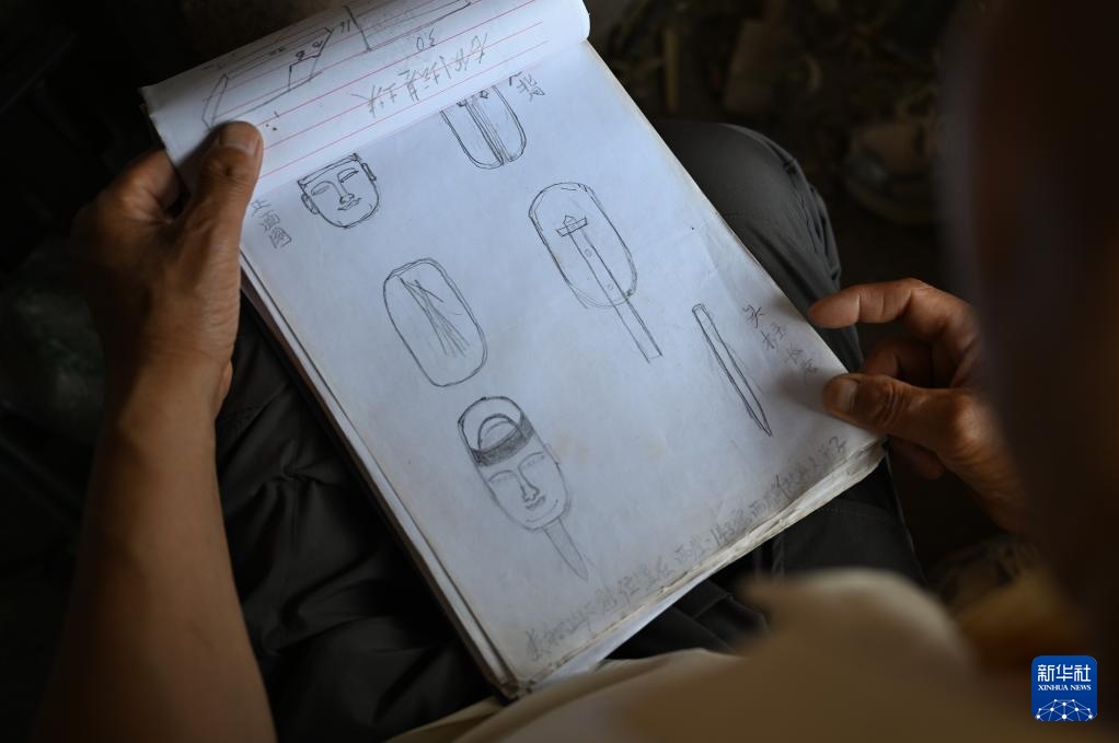 牟常有在麦积山石窟翻看自己绘制的修复草稿图(7月16日摄)。