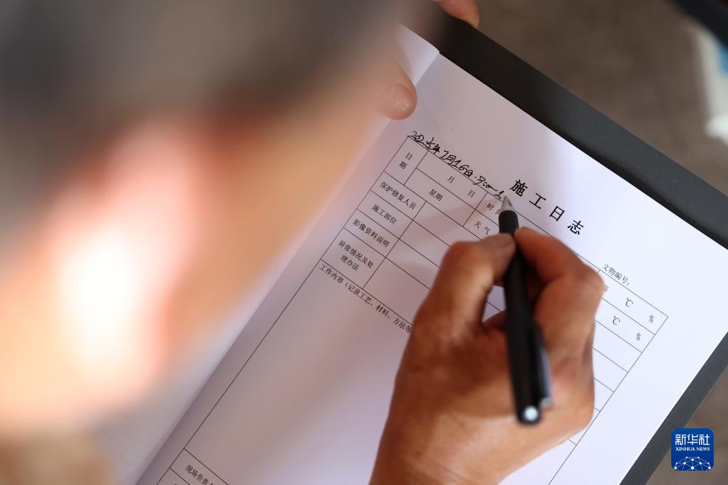 牟常有在麦积山石窟157窟前填写文物修复施工日志,为修复工作做准备(7月16日摄)。