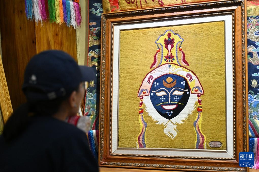 7月18日,一名参观者在江孜藏毯文化发展有限责任公司的展示厅内观看藏戏脸谱图样的藏毯产品。