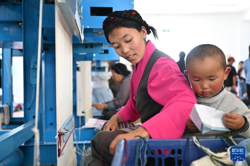 7月18日,江孜藏毯文化发展有限责任公司的员工次仁卓玛带着儿子在生产车间内编织藏毯。
