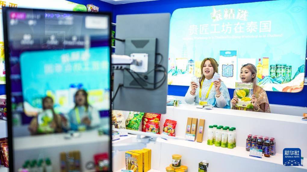 7月26日,留学生在跨境电商展区直播带货。